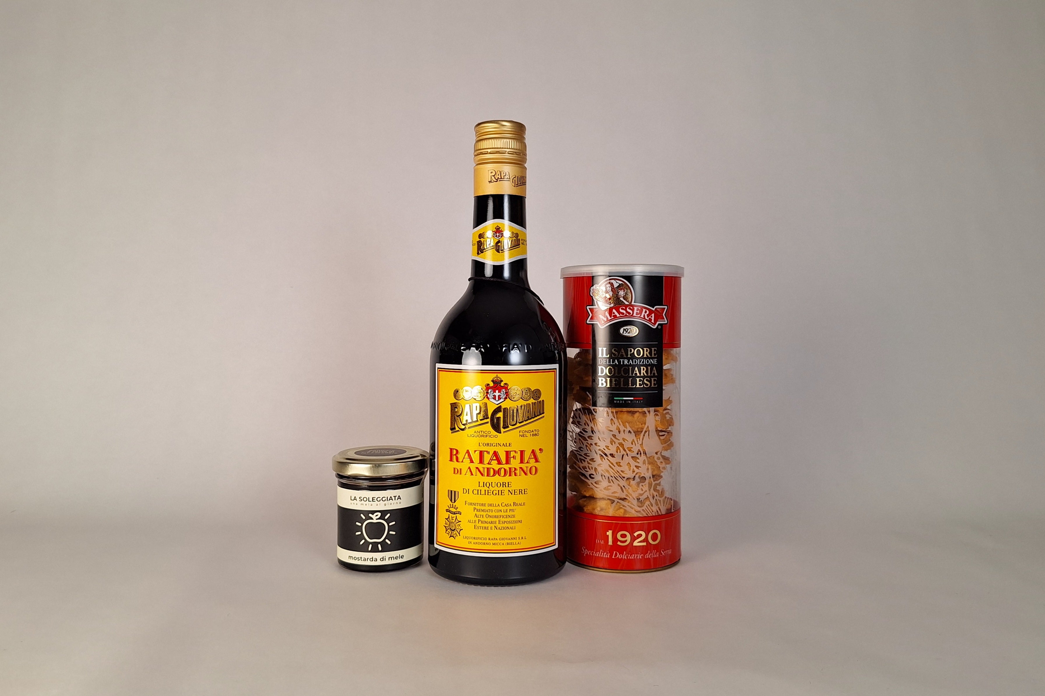 Ratafià di Ciliegie Rapa Giovanni (70 cl), Paste di Meliga della Pasticceria Massera (200 g) e Mostarda di Mele dell’Azienda Agricola La Soleggiata (110 g).