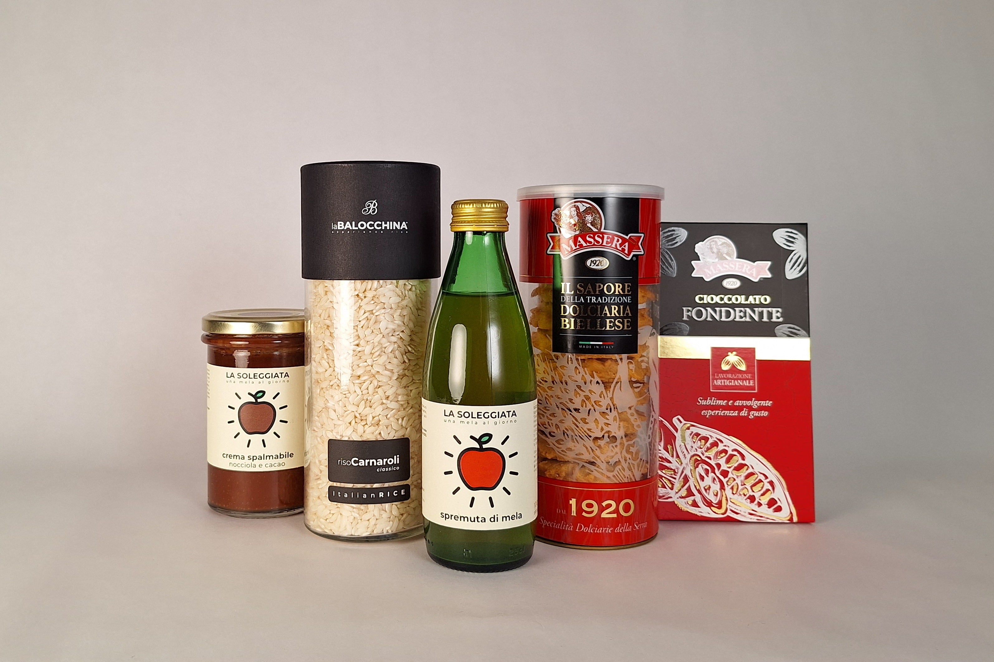 Riso Carnaroli La Balocchina (480 g), crema spalmabile alla nocciola e cacao a base di mela (300 g), succo bio di mela La Soleggiata (250 ml), Paste di Meliga della Pasticceria Massera (200 g) e una tavoletta di cioccolato fondente (80 g).