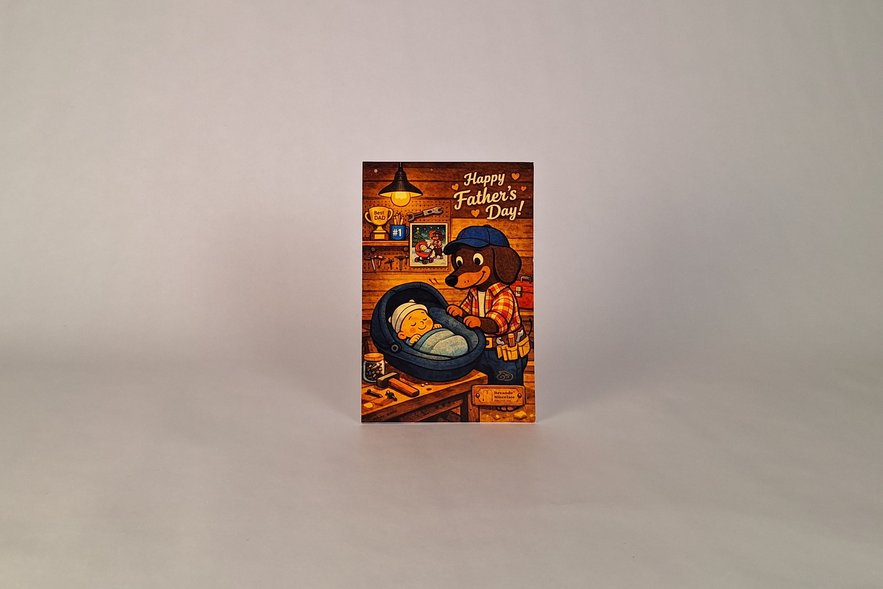 Bassotto fumettato: illustrazione colorata e simpatica con protagonista un papà bassotto in versione fumetto, ideale per chi cerca un biglietto più giocoso e originale.