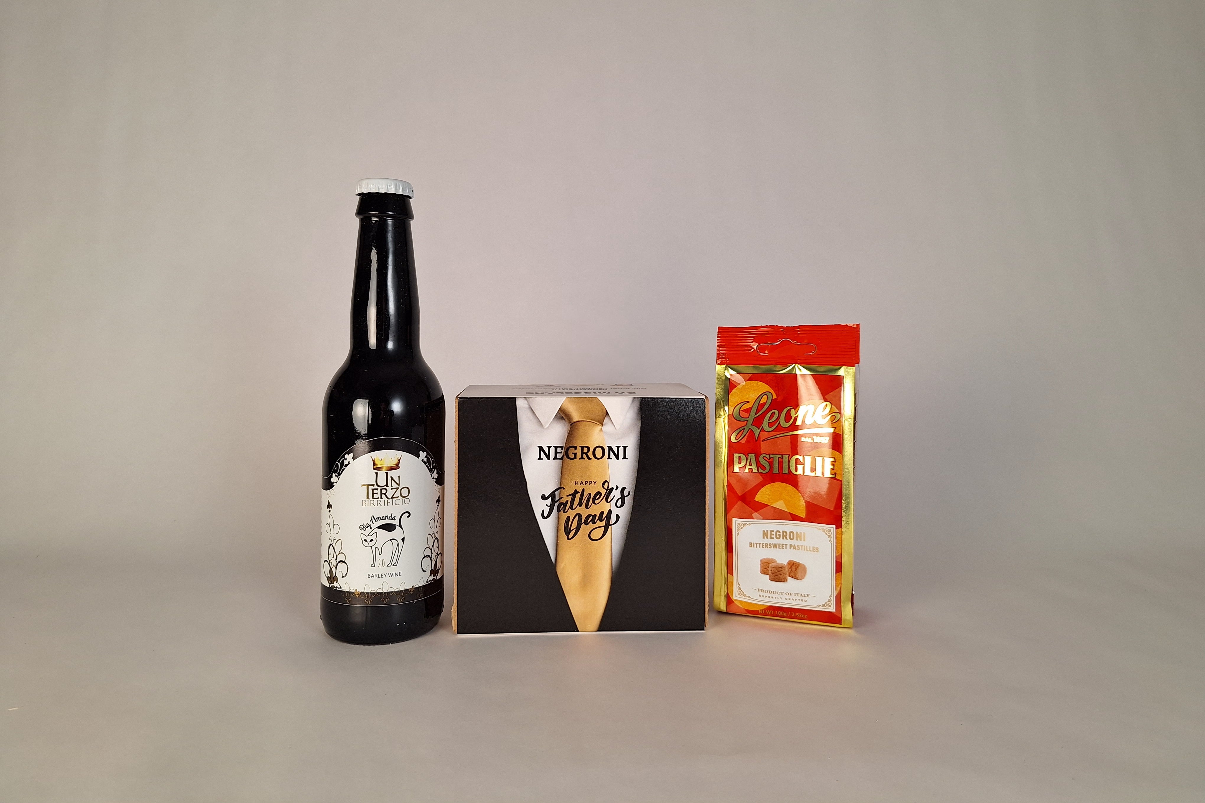 All’interno trovi il Kit Negroni per la Festa del Papà, in versione per due persone, con grafica dedicata e ingredienti selezionati per preparare a casa uno dei grandi classici dell’aperitivo italiano: Vermouth rosso, London Dry Gin e Bitter Campari.