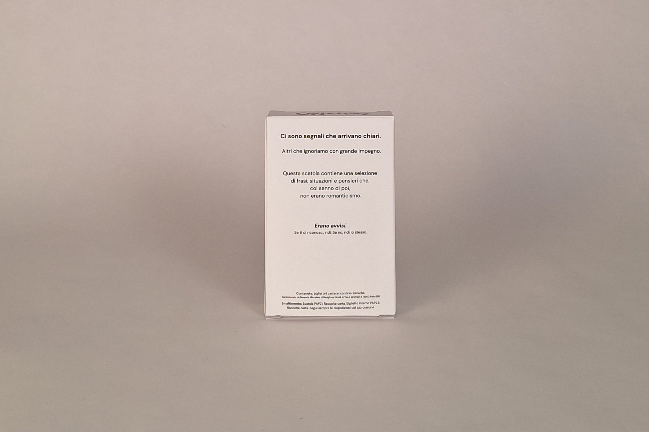 Packaging interamente riciclabile. Prodotto ironico e satirico, pensato per far sorridere. Non contiene messaggi motivazionali, promesse o buoni consigli. Fa ridere perché è vero. Non perché fa male.